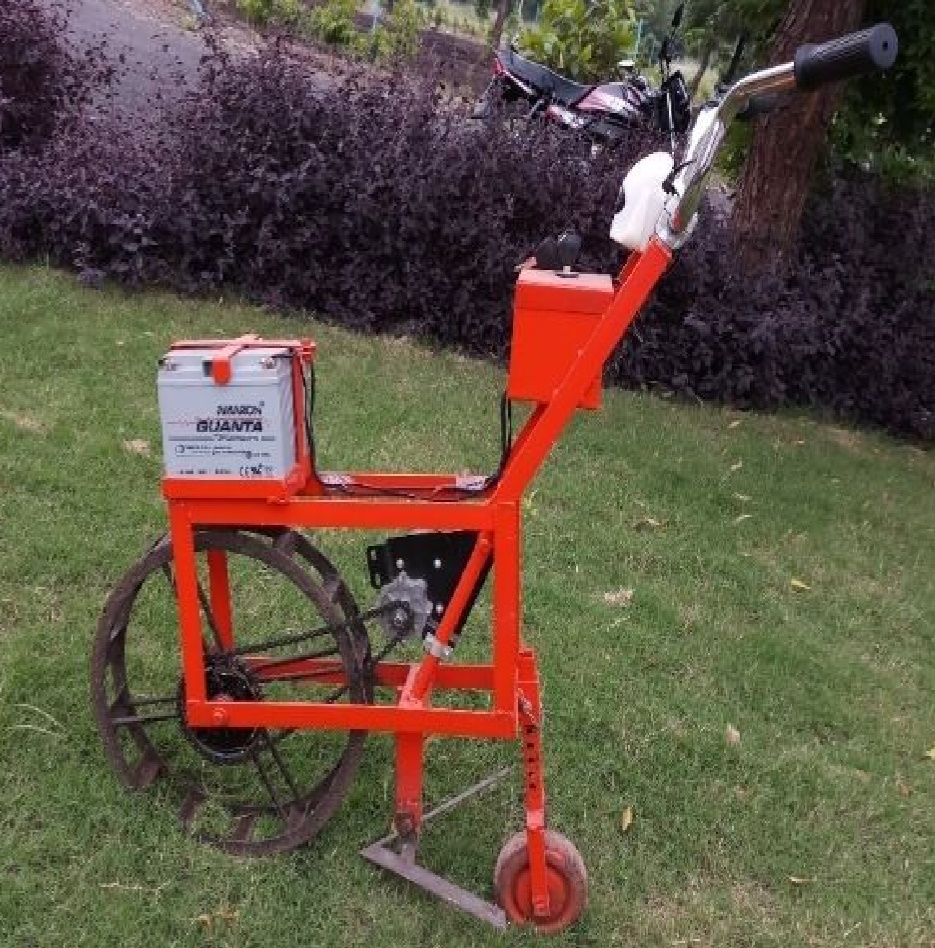 | - Battery electric vehicle operated sprayer satisfactorily transverse in between 30, 45, 60 and more than 90 cm row spacing crops.