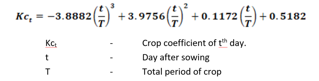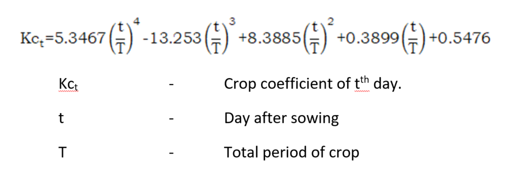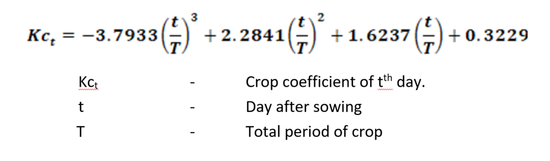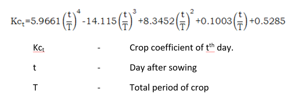- For estimation of near real time spatial and temporal crop coefficient values and getting accurate water requirement of rabi wheat and onion, it is recommended to use Normalized Difference Water Index (NDWI) based following equations: